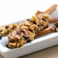 3. Dip each pretzel into caramel mixture, covering about 2/3 of the pretzel. Let caramel drip off slightly. Spoon or roll some of the crumb mixture onto the caramel, pressing crumbs lightly into caramel with back of a spoon. Let stand on nonstick foil until caramel is set. Store in an airtight container between layers of wax paper in refrigerator up to 4 days or freeze up to 1 month. Makes 25 pretzel rods or 15 whole Bavarian pretzels.