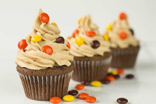 Spread frosting onto cupcakes with an offset spatula or a pastry bag fitted with a large star tip. Sprinkle with Reese’s Pieces.