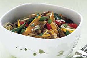 ADD sugar snap peas, yellow pepper and remaining dressing mixture to skillet; cook and stir 3 min. until vegetables are crisp-tender. Return steak to skillet; stir-fry 1 min. Remove from heat; stir in tomato and cilantro. Serve over hot cooked pasta.