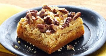 Sprinkle the yellow cake mix over the top of the pumpkin mixture and pat down. Sprinkle the chopped pecans over the top of the cake mix then drizzle the melted margarine all over the top.