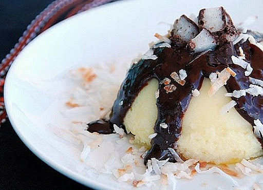 Coconut Custard with Mounds Candy Bar Chocolate Sauce
