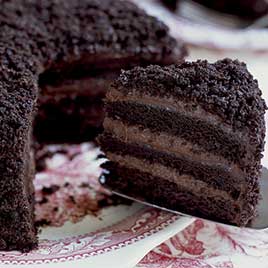 8. Using an offset spatula, spread 1 cup pudding over bottom layer. Top with next layer, then another 1 cup of pudding, then the last layer. Frost top and sides of cake with remaining pudding. Be sure to push pudding in between layers when frosting sides. Sprinkle top and sides with cake crumbs, pressing lightly to adhere crumbs. The cake can be refrigerated for up to 2 days.
