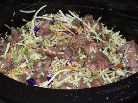 Place all ingredients in crock pot except the broccoli slaw, sesame seeds and kuzu root. Cook on low for 5-6 hours. Add the broccoli slaw in the last hour. If the sauce needs thickened, add the kuzu root and stir. Cook about 15 minutes more to allow the sauce to thicken. Add sesame seeds just before serving.