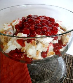 •In a nice large bowl, spoon 1/2 the mixture onto the bottom, top with about 3/4 of the cherry pie filling.