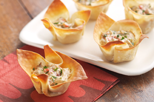 PLACE 1 won ton wrapper in each of 24 mini muffin pan cups sprayed with cooking spray, extending edges of wrappers over tops of cups. Bake 5 min. Meanwhile, mix remaining ingredients until well blended.