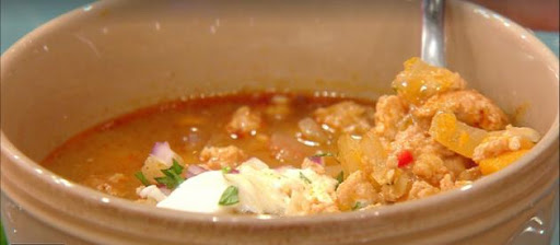 Top the chili with the lime juice and cilantro. Garnish each bowl with a dollop of sour cream and a little bit of minced raw onion.