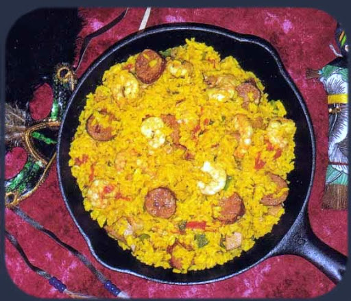 Saute sausage in large saute pan or braiser pan that has a good cover until slightly browned . Add oil, onions, celery and saute until transluscent. Add peppers & garlic heat 2 minutes then add sesonings & liquid smoke. Stir 1 minute add rice. Stir 1 minute to coat rice. Add tomatoes & stock bring to simmer with cover on pan. Cook until liquid is absorbed. Remove bay leaf. If using, place shrimp on top of rice & cover. Cook until shrimp become opaque. Garnish with chopped parsley. Enjoy. Serves 4 .