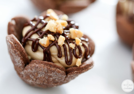 For the drizzle, melt the chocolate chips and shortening in a microwavable bowl (or in a double broiler). Allow the mixture to cool slightly, then transfer to a plastic bag. Snip off a tiny portion of one corner of the bag and drizzle the chocolate onto the filled pie shells. Top with chopped peanut for a garnish.