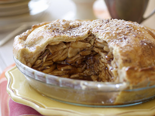 Bake the caramel apple pie for 25 minutes on the middle rack. In a small bowl, combine the remaining 1/4 cup of sugar with the freshly grated cinnamon. Remove the foil from the pie and brush the top with the remaining egg white. Sprinkle evenly with the cinnamon sugar and return to the oven. Continue to bake for another 25 minutes, until the pie is golden and bubbling. Let the apple pie rest at room temperature for at least 1 hour to allow the fruit pectin to gel and set; otherwise the pie will fall apart when you cut into it.