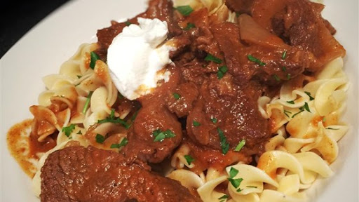 Once goulash is finished, dissolve sour cream and a little of the goulash sauce in a cup. Add to goulash, it should give a creamy consistency. Serve goulash with spaetzle on the side, adding an extra dollop of sour cream to each plate.