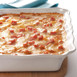 Preheat oven to 350°. In a large bowl, combine the first eight ingredients. Add potatoes, ham and cheese; toss to coat. Transfer to a greased 13x9-in. baking dish.