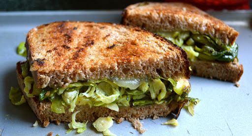 Chop brussels sprouts until shredded. Lay bread on workable surface. Then layer on cheese and heave on shredded sprouts. Sprinkle with more back pepper, top with more cheese, and top with another slice of bread. Brown in skillet (yes, the one coated in the sage butter. Trust me.) until cheese is melted and bread is browned, about 3 minutes each side. Remove from heat, slice in half, and serve. Makes two sandwiches.
