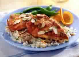 4. When rice is cooked, fluff with fork and stir in orange marmalade. Place rice on serving platter; arrange chicken on rice. Sprinkle with almonds and parsley. Garnish with orange slices.