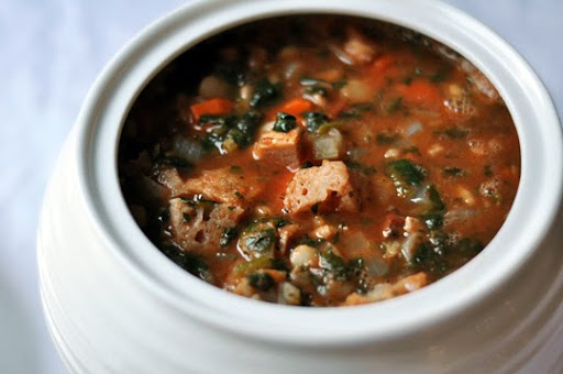 Heat a heavy-bottomed pot over medium-high heat. Add oil. When the oil is hot, add the garlic, onion, carrots, celery, and bay leaf and season with salt and pepper. Sauté until softened, 5 to 7 minutes. Add the frozen spinach and sauté for a moment to break up any large clumps.