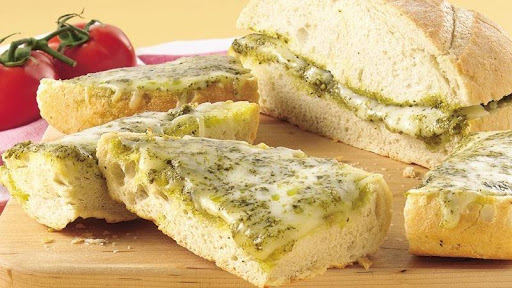 1 Heat gas or charcoal grill. Cut 18x18-inch sheet of heavy-duty foil. Cut loaf of bread in half lengthwise. Spread each half with pesto. Sprinkle with cheese.