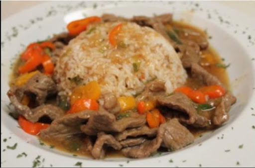 Pour the vegetable oil into a pan, and place the pan over medium high heat. Add the steak, and season it with salt, pepper, and garlic powder. Fry the steak until it's fully cooked. Add in the peppers and onions, and fry for about 3 minutes. Sprinkle in the onion gravy seasoning, and stir. Pour in 1 1/2 cup of water, and stir all the ingredients. Reduce the heat from medium high to medium, and continue to cook for 10 minutes.