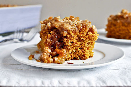 In a small bowl mix together 1/2 cup of brown sugar, 1/2 cup flour, walnuts, and melted butter. Use fingers to sprinkle over the top of the cake. Bake at 350 for 25-30 minutes, or until a toothpick inserted comes out clean.