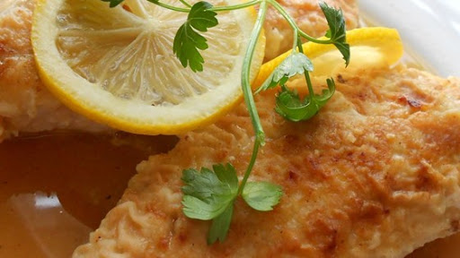 Pound 10 chicken breasts flat. Dredge in flour, shaking off excess. Dip in egg batter and saute in hot olive oil until golden brown on both sides. Transfer to baking sheet and bake approximately 30 minutes.