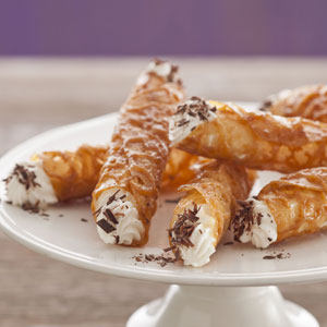 •For filling, in a large bowl, beat cream until it begins to thicken. Add confectioners' sugar and brandy; beat until stiff peaks form. Just before serving, pipe cream mixture into cookies. Sprinkle ends with chocolate if desired. Refrigerate leftovers. Yield: 4 dozen.