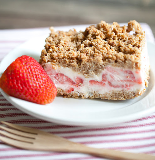 In a buttered glass cake pan, press half of the crumb crust mixture on the bottom. Top with strawberry mix and then add the remaining crumbs to the top.