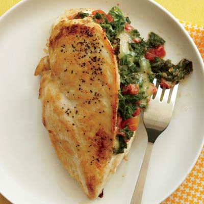 1.Cook kale in pot of boiling, salted water for 5 minutes; drain and run under cold water. Squeeze dry and transfer to bowl; stir in tomatoes and cheese. Cut a deep pocket in center of each breast; stuff with kale mixture and season. Heat EVOO in skillet over medium heat; add chicken and cook until well browned, about 15 minutes.