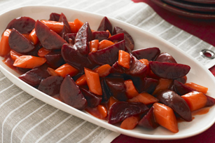 WRAP beets individually in foil; place in shallow pan. Toss carrots with oil in large shallow baking dish. Bake beets 1 hour 15 min., adding carrots to oven after 45 min.