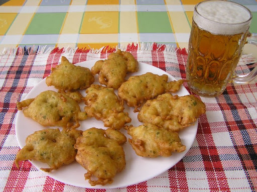 En un cuenco apropiado desleímos las harinas, la levadura con la cerveza, le agregamos el huevo y lo batimos, agregamos a continuación la cebolla y el ajo sofritos, el perejil picado, los camarones y una pizca de sal y mezclamos bien.