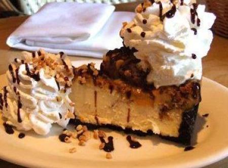 Just before serving, drizzle fudge topping over cheesecake, and top with whipped cream