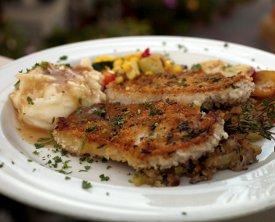 1. Combine the corn flake crumbs, garlic powder, salt, pepper and sage together in a large flat pan. Mix well.