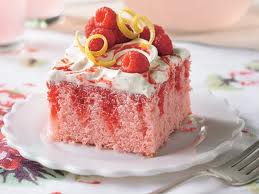 Pour the cake mixture into a greased cake pan. Bake at 350 degrees for 30-35 minutes until toothpick comes out clean. Poke warm cake every inch with fork. Remove t tablespoon of the reserved jello mixture to separate bowl. In a another small bowl, mix remaining jello mixture with remaining lemonade concentrate. Pour slowly over cake evenly. Cool completely.