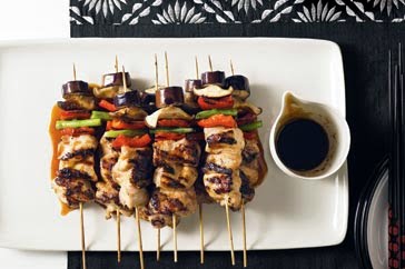 Drain the chicken from the marinade. Thread the chicken, capsicum, shallot, mushrooms and eggplant onto the skewers.