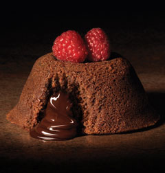 To make cake, heat oven to 400°F. Spray six 4-ounce ramekins or custard cups with cooking spray. Melt 4 ounces of chocolate (1 baking bar) and butter in double boiler; whisk gently to blend. With an electric mixer, whisk eggs, yolks, sugar, and vanilla on high speed about 5 minutes or until thick and light. Fold melted chocolate mixture and flour into egg mixture just until combined. Spoon cake batter into ramekins. Place a chocolate ball in the middle of each ramekin.