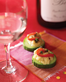 Dividing evenly, dollop chickpea puree onto cucumber slices, top with a roasted red pepper strip and thyme leaves. Serve immediately.