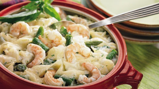 Add cooked pasta, shrimp, asparagus and parsley; toss gently to mix. Pour into sprayed casserole. Cover with foil.