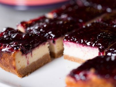 When ready to serve, remove the cheesecake from the pan by lifting the edges of the foil. Slice into 15 pieces with a long serrated knife.
