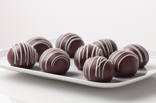 2) Shape into 42 (1-inch) balls. Freeze 10 min. Dip in semi-sweet chocolate; place in single layer in shallow waxed paper-lined pan.