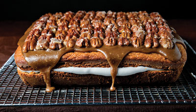 3, Make the praline topping: Bring remaining butter, salt, brown sugar, confectioners' sugar, and milk to a boil in a 2-qt. saucepan over high heat; cook 5 minutes. Remove from heat, stir in remaining vanilla, and let cool, without stirring, until thickened, about 15 minutes. Pour sauce over cake, and arrange candied pecans on top.