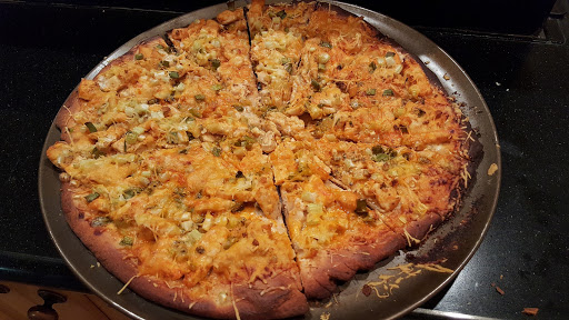 Spread desired amount of blue cheese dressing on pizza crust. Spread chicken/wing sauce over crust.