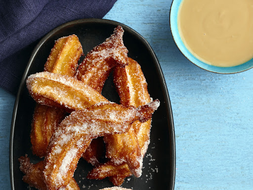 Fill a shallow dish with sugar for coating the churros (about 1/2 cup). Heat about 2 inches vegetable oil in a wide saucepan until a deep-fry thermometer registers 350 degrees F. Working in batches of about 6, pipe 3-inch-long segments of batter into the hot oil; use a knife to cut off the segments. Fry, turning once, until golden brown, about 3 minutes per batch. (Return the oil to 350°F between batches.) Transfer to a paper towel-lined plate to drain briefly, then roll in the sugar. Serve with the coconut sauce.