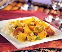In India, the people grind fresh curry powder each day, combining as many as 16 to 20 spices. You can shortcut that step with your favorite ready-to-eat blend, but don't skimp on the toppings: Raisins and peanuts balance the spicy mixture witha hint of sweetness.