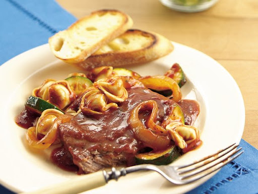 Round steak turns out moist and tender when cooked in a tasty tomato sauce all day long! Tortellini is the finishing touch.