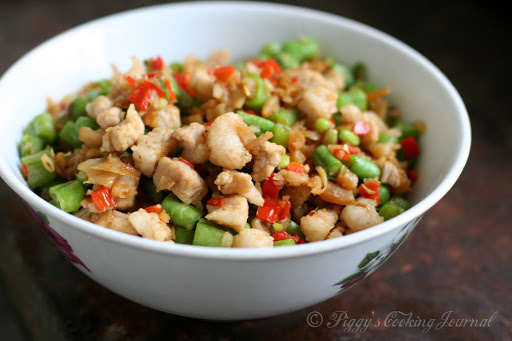 2) Dice pork, dried shrimps, chillies and long beans into small cubes, set aside.