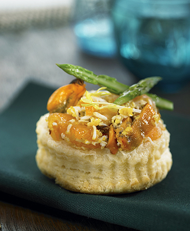 En una sartén con aceite y 1 cda. de mantequilla caliente, saltee la cebolla junto con el curry. Retire los mejillones de la valva y agregue a la preparación anterior junto con los langostinos limpios y pelados. Luego incorpore los echalottes y la mantequilla restante. Condimente con sal y pimienta y agregue la harina. Mezcle. Vierta ¾ taza de vino blanco y la crema. Cocine durante 10 minutos hasta que espese. Retire del fuego, deje entibiar y agregue el huevo. Mezcle.