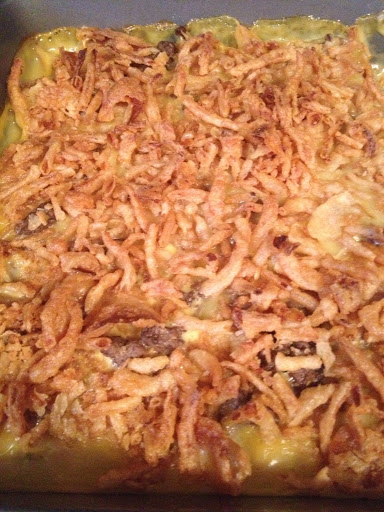 Take out of oven & top with can of french fried onions; bake, uncovered, an additional 15 minutes.