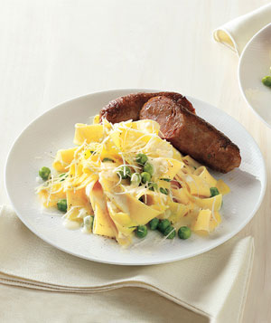 3. In a medium bowl, whisk together the egg yolks, half-and-half, Parmesan, ½ teaspoon salt, and ¼ teaspoon pepper. Add the egg mixture and reserved cooking water to the pasta and peas in the pot. Cook over low heat, tossing gently, until the sauce is slightly thickened and coats the pasta. Serve with the sausage and additional cheese.