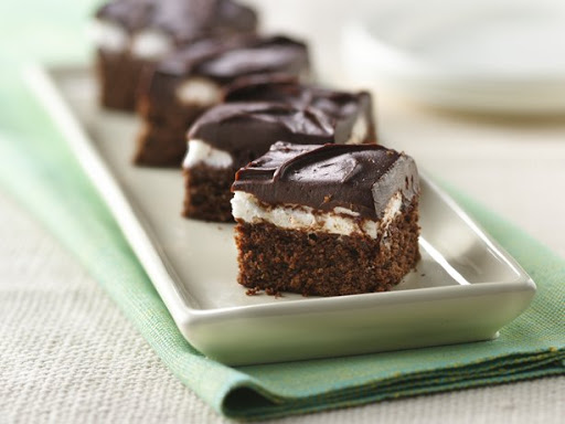 4 In 1 1/2-quart saucepan, melt remaining 2 1/2 ounces chocolate and 1 tablespoon butter; cool slightly. Stir in sour cream and powdered sugar until smooth. Spread over marshmallow layer. Cover; refrigerate at least 2 hours or until firm. For bars, cut into 6 rows by 6 rows. Store in refrigerator.