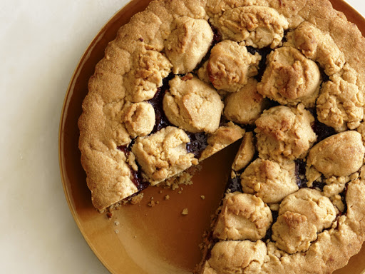 Press half of the dough into the prepared tart pan. Spread the jam over the dough, leaving a 1/2-inch border around the edge. Drop about half of the remaining dough over the jam by the tablespoonful. Lightly press the rest of the dough into the pan around the edge to form a crust.