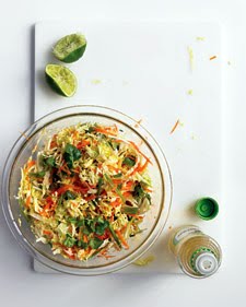In a large bowl, combine 2 tablespoons fresh lime juice, 2 tablespoons rice vinegar, 1 tablespoon vegetable oil, and 2 teaspoons sugar; season with salt and whisk. To dressing, add 1/2 small head shredded Savoy or green cabbage, 1 cup fresh cilantro leaves, 4 scallions, cut into matchsticks, 1 grated carrot, and 1/2 fresh jalapeno, minced, and toss to combine.