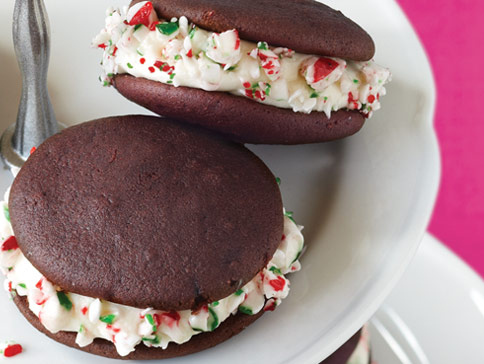 5. Fold 1/4 cup crushed candy canes into the filling. Sandwich level tablespoons of filling between 2 pies, spreading to the edges. At this point, they can be refrigerated overnight in a parchment paper-lined airtight container, with parchment between pies if they are stacked. Just before serving, dab filling edges into remaining candy cane and lightly pat pieces into place. Transfer to a platter and serve immediately.
