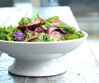3. Meanwhile, add kale to roasting pan. Toss with remaining oil, garlic, salt, and pepper. Roast, uncovered, 15 minutes, tossing 3 times. To serve, gently toss with onions. Serves 8.